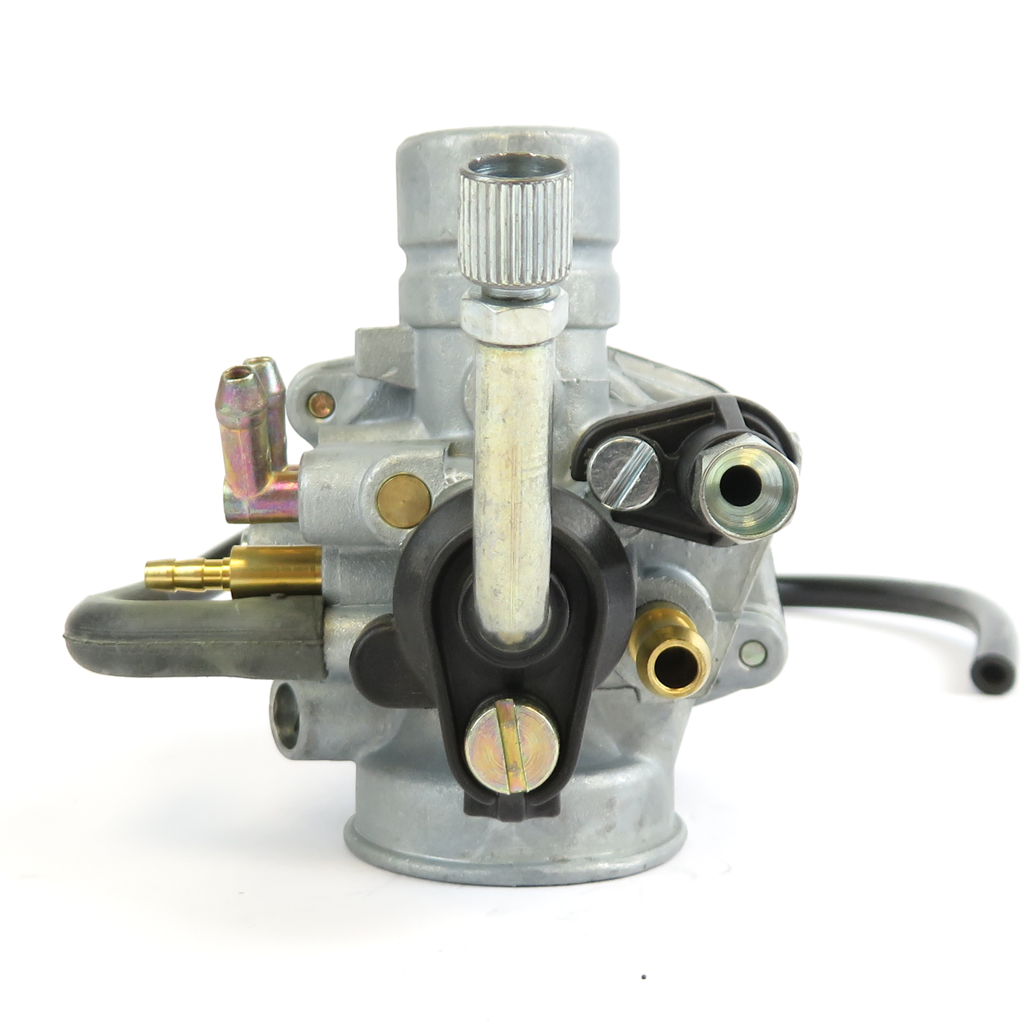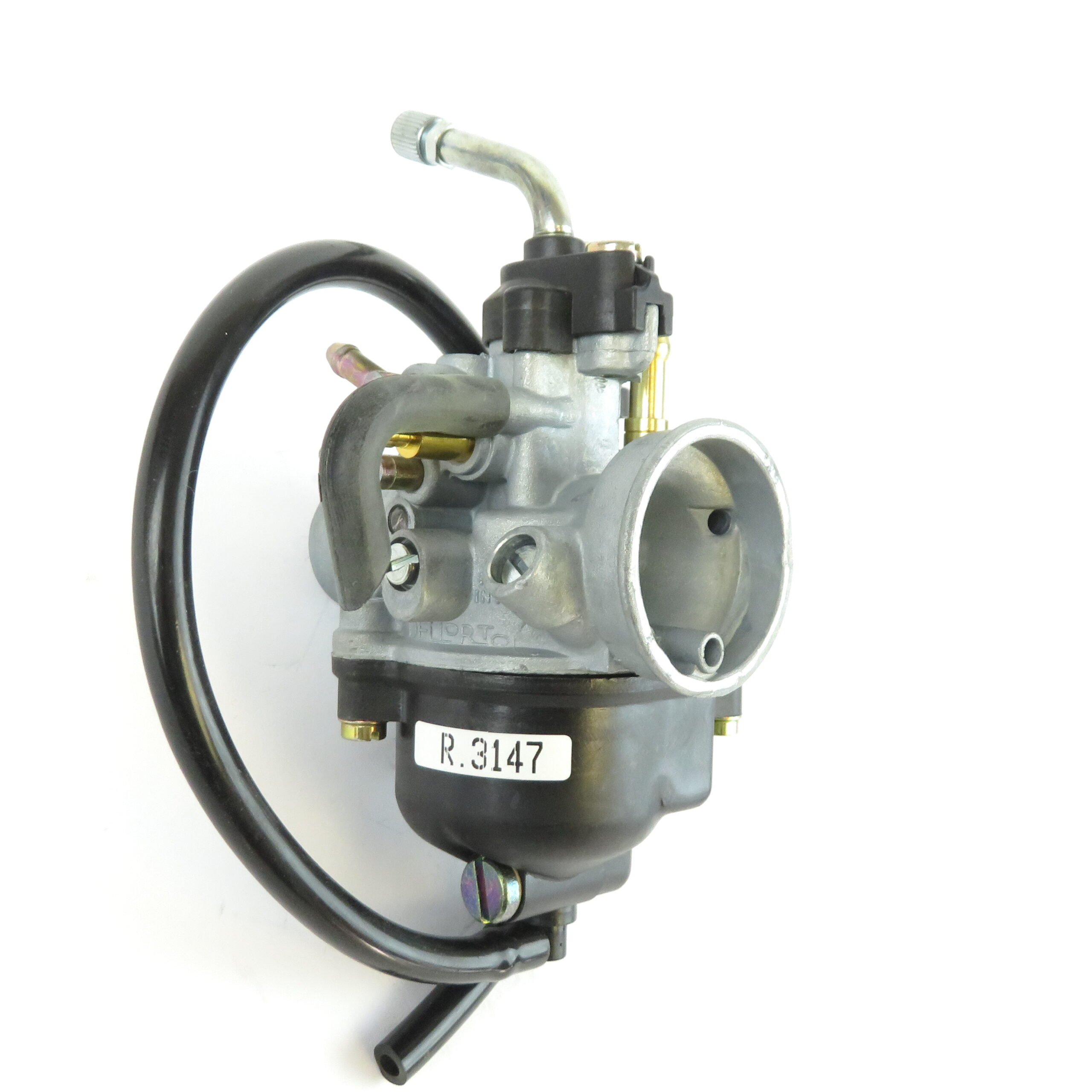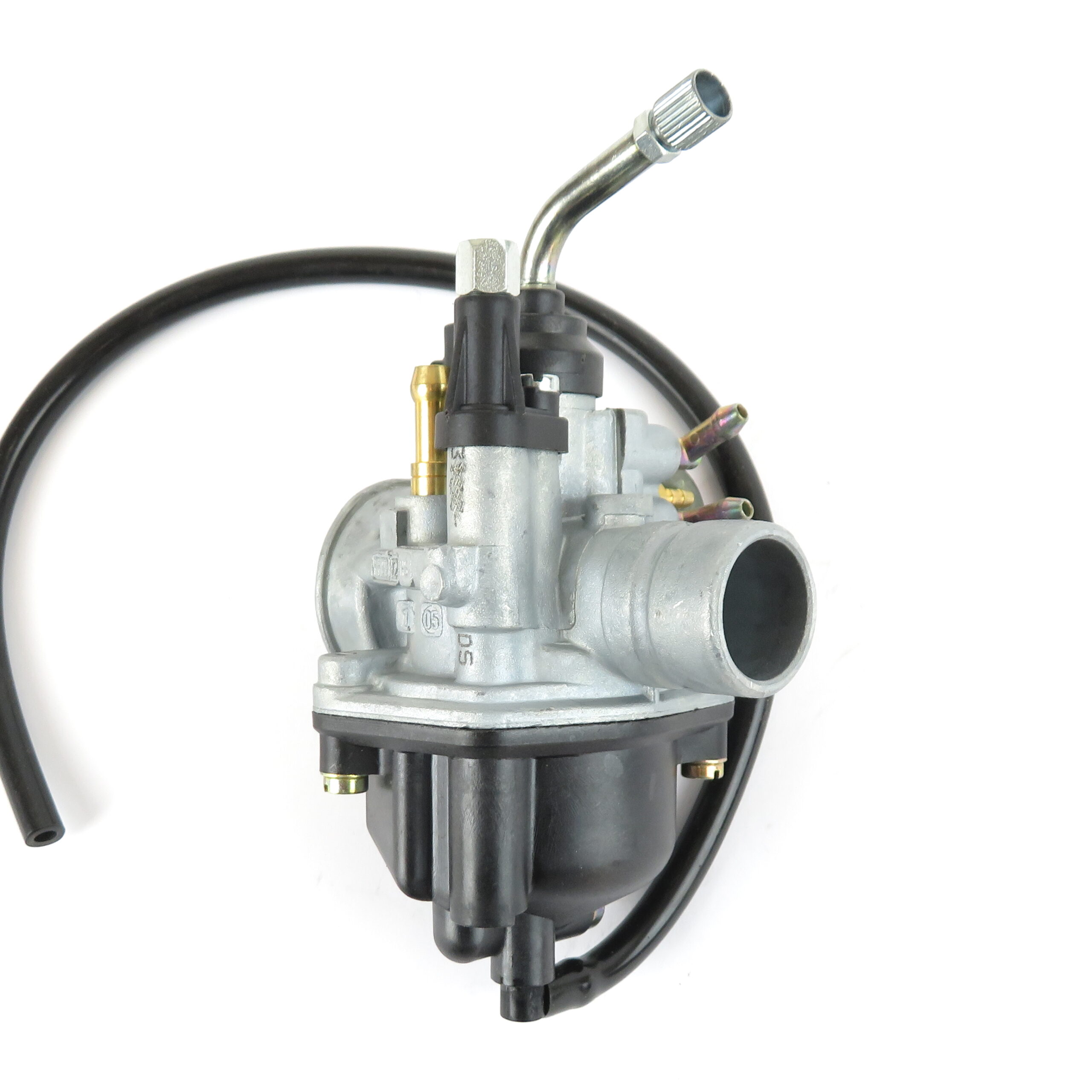 38mm Plain air intake. 24mm Rubber sleeve type engine connection. Cable type operated choke mechanism fitted. Oil feed connection.