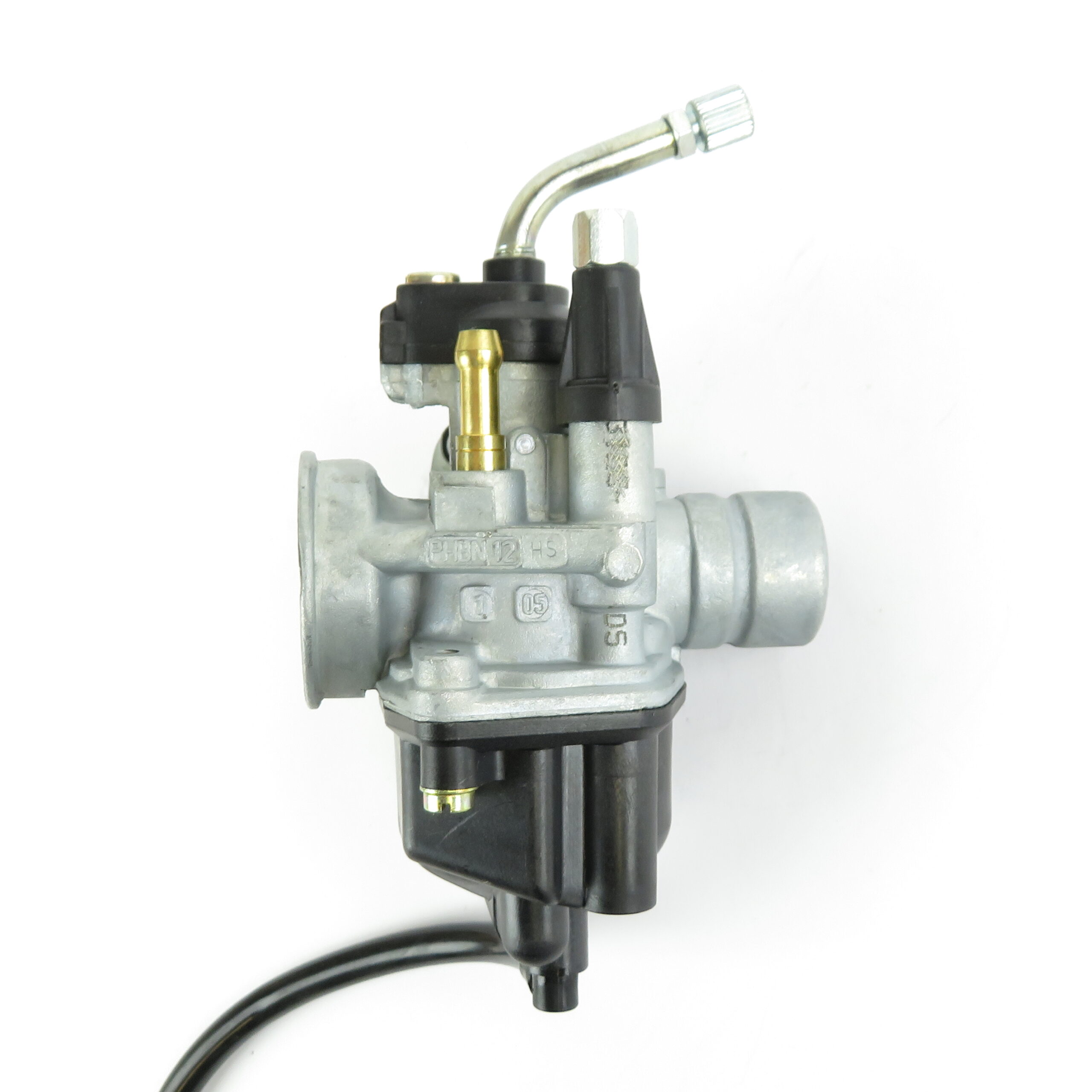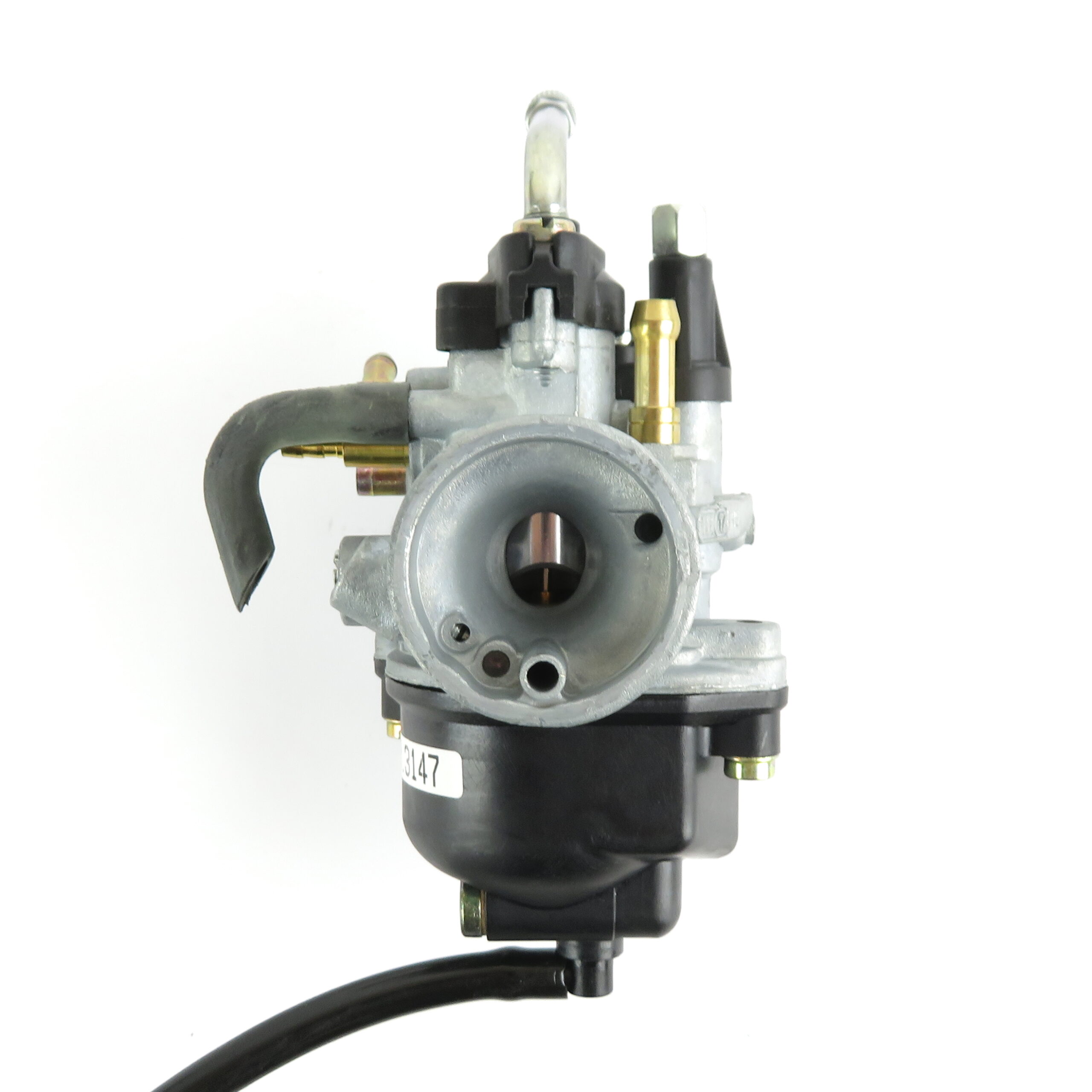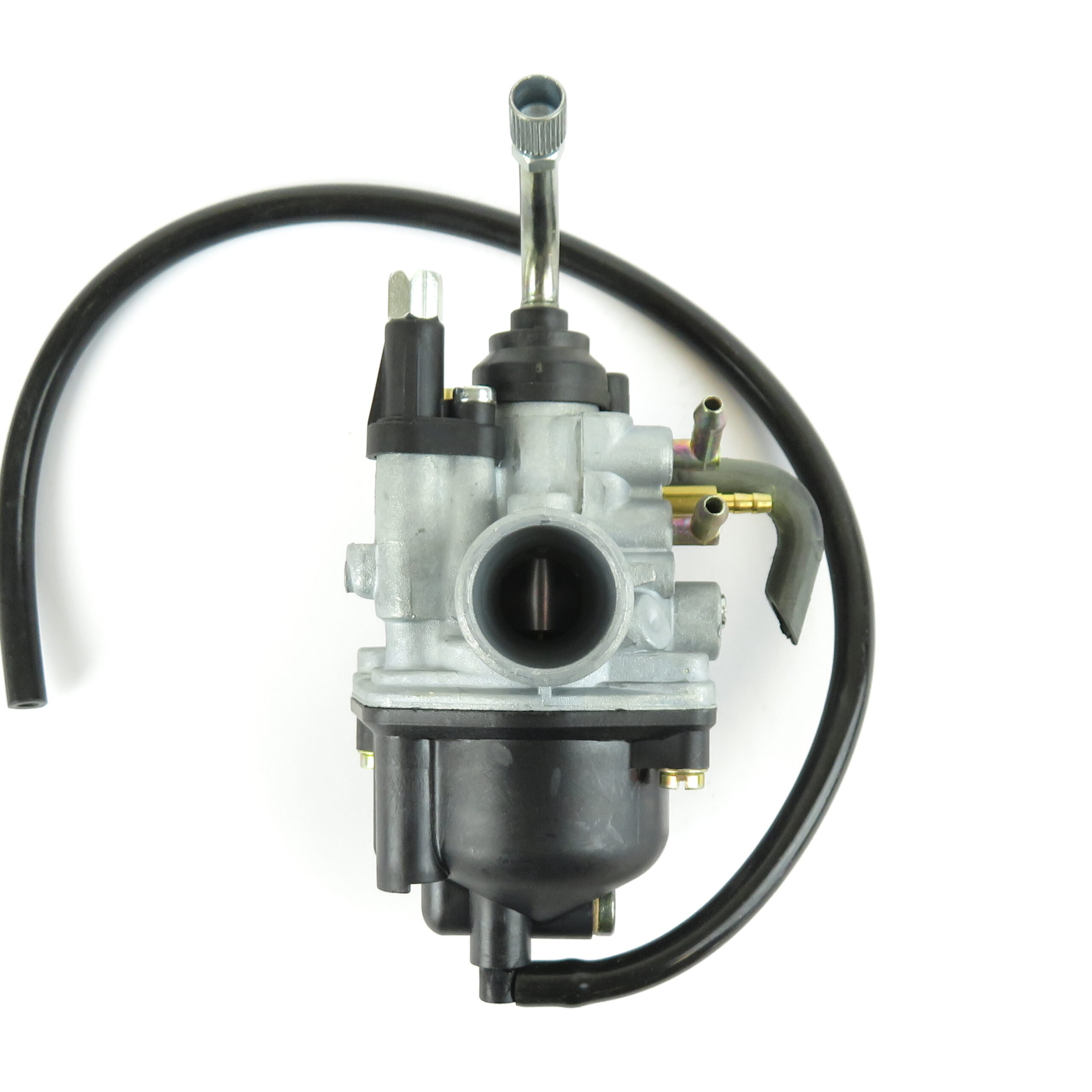 38mm Plain air intake. 24mm Rubber sleeve type engine connection. Cable type operated choke mechanism fitted. Oil feed connection.