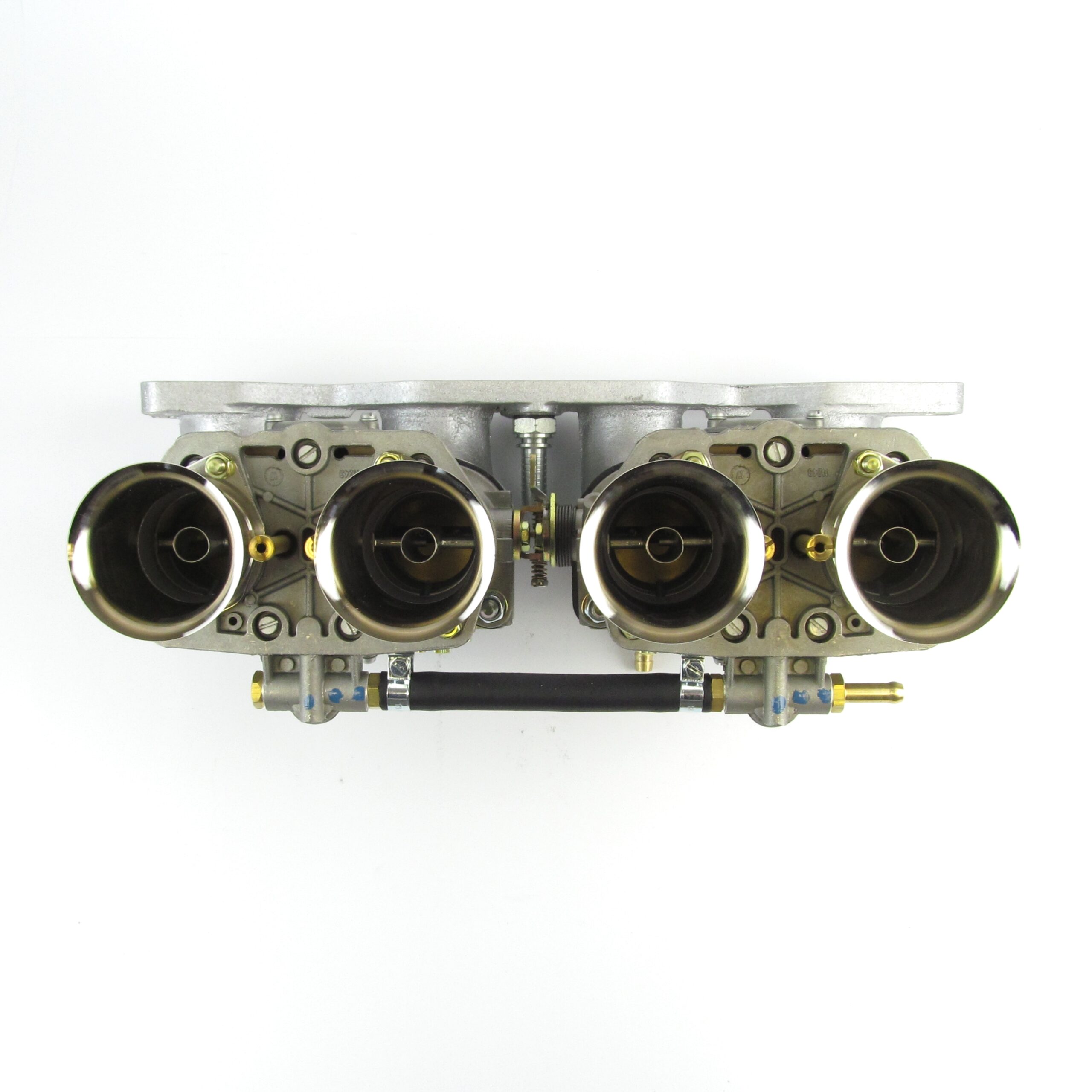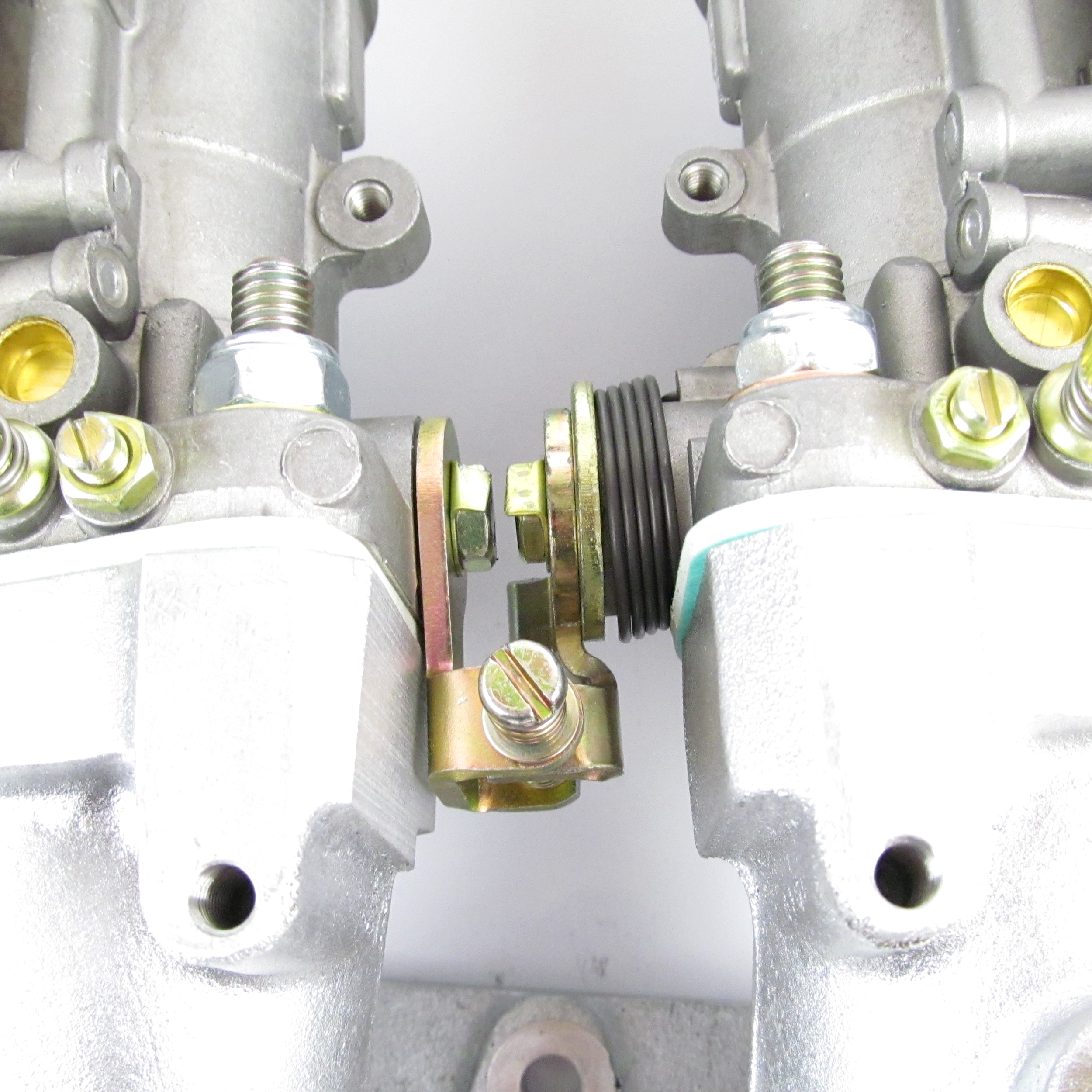 These carburettors have not got a starting mechanism (choke) fitted, but are fitted with a blanking plate instead. The carburettors also have had their spindles and levers modified by Weber to allow them to fit onto the manifold.
